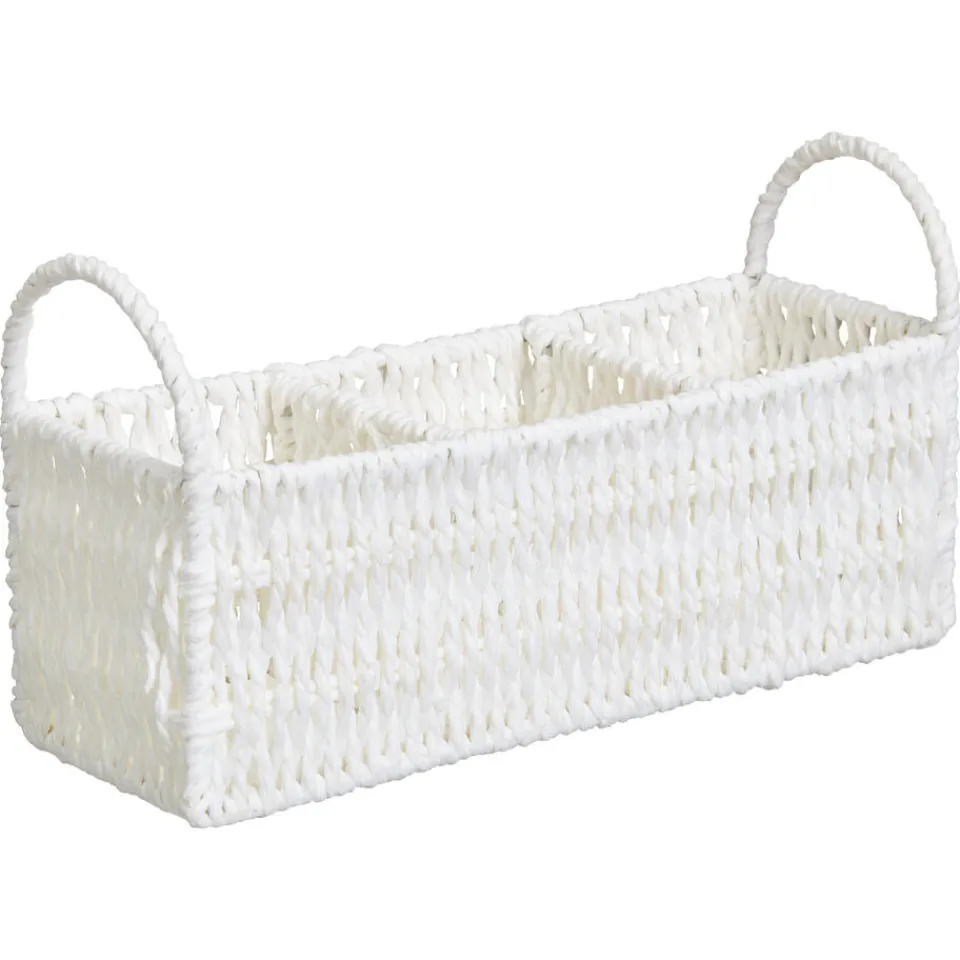De Trillo opbergmand is een stijlvolle, rechthoekige mand van 100% papier in een witte kleur. Met afmetingen van 28x10x10 cm is deze mand perfect voor kinder- en woonkamers. De mand heeft twee handvatten en is verdeeld in drie vakken, ideaal voor het opbergen van spullen. Creëer een sfeervolle ruimte met deze praktische en decoratieve opbergoplossing!