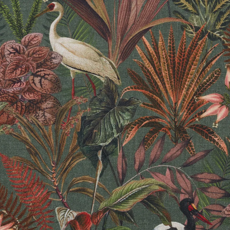 Stof Imke in een groene kleur met patroon. Deze stof heeft een botanisch patroon met vogels en is gemaakt van 100% katoen. De patroonhoogte is 27 centimeter.