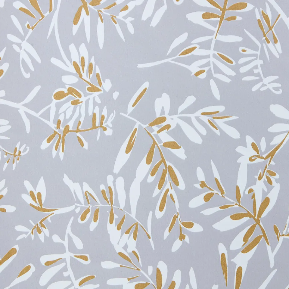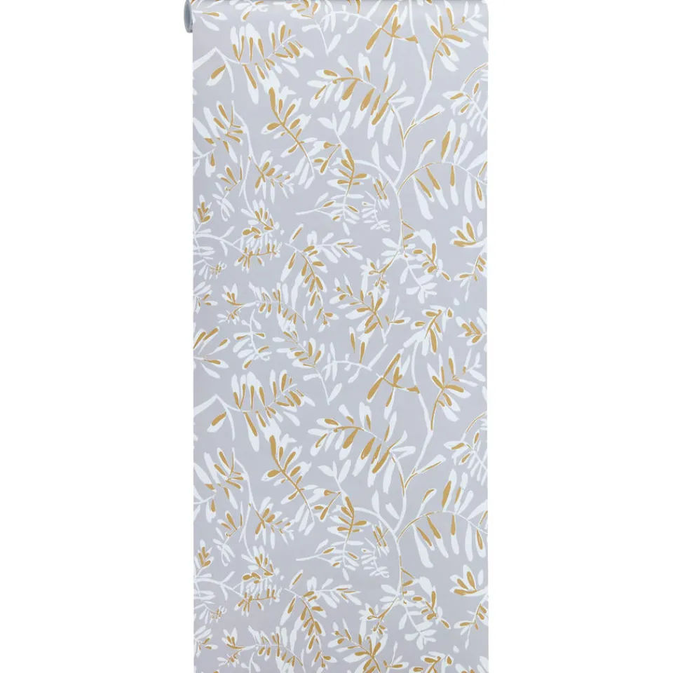Vliesbehang Bloss in sfeervolle grijze en okergele kleur met een prachtig bladeren patroon.Het behang is voorzien van het FSC-keurmerk. Plakken met Perfax Pink. 10 meter per rol.