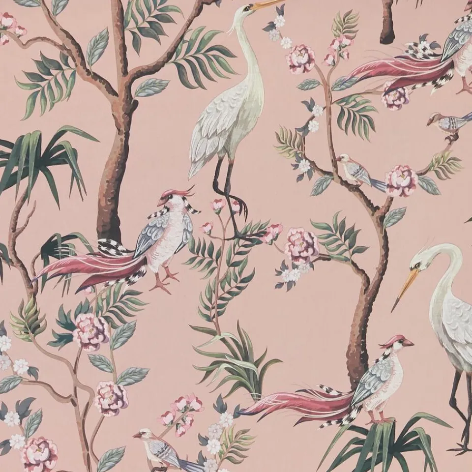Vliesbehang roze met botanische print. Plakken met Perfax Paars. 53 cm breed.