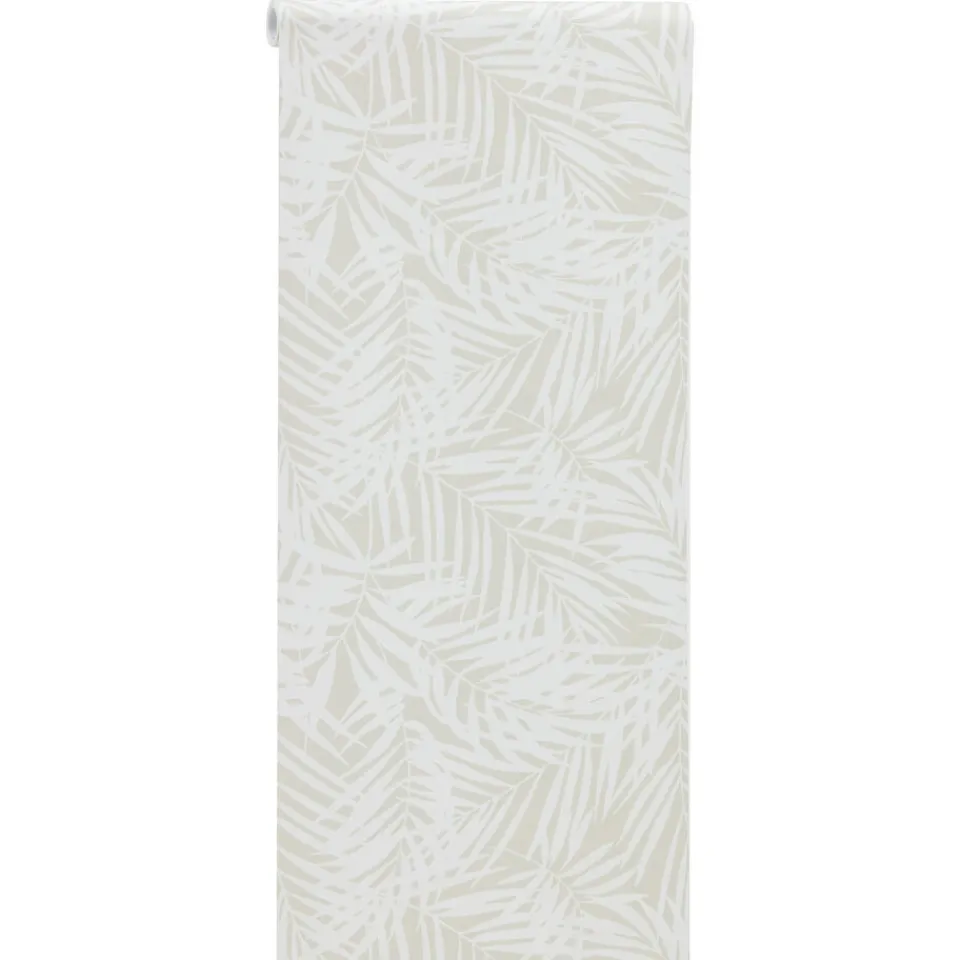 Vliesbehang Micha in sfeervolle zand kleur met bladeren patroon.Het behang is voorzien van het FSC-keurmerk. Plakken met Perfax Pink. 10 meter per rol.