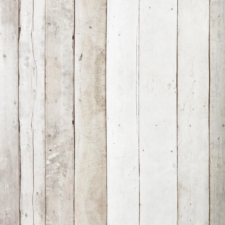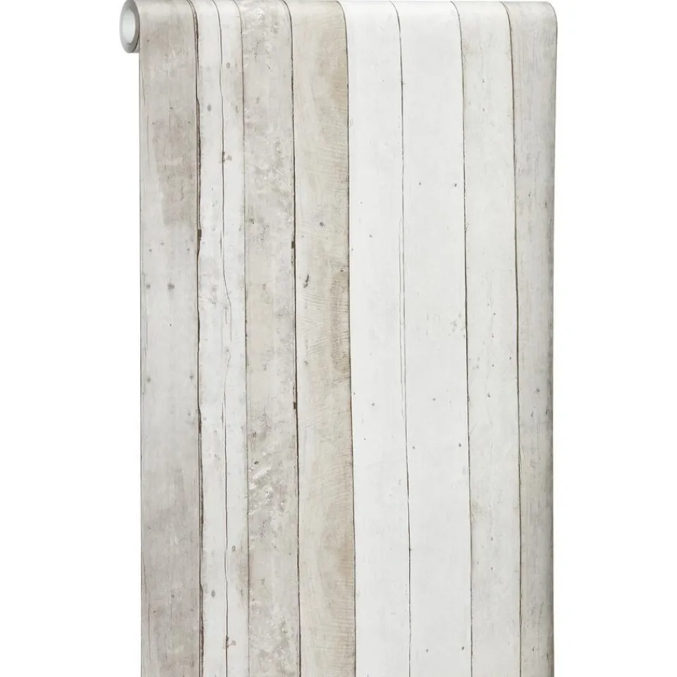 Stoer vliesbehang met steigerhoutprint. Kleur: grijs.
