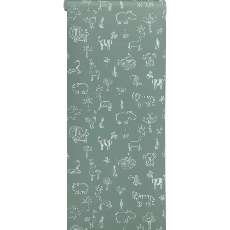 Vliesbehang Veerle in sfeervolle groene kleur met een prachtig dieren patroon.Het behang is voorzien van het FSC-keurmerk. Plakken met Perfax Pink. 10 meter per rol.