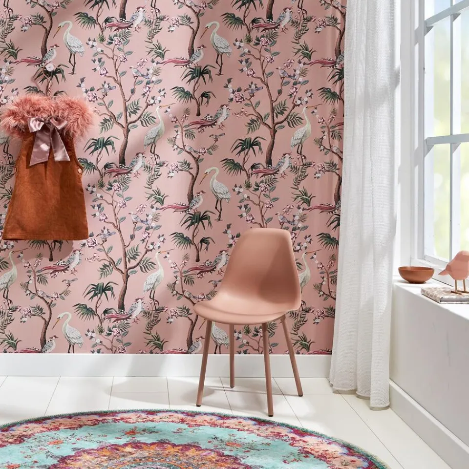 Vliesbehang roze met botanische print. Plakken met Perfax Paars. 53 cm breed.