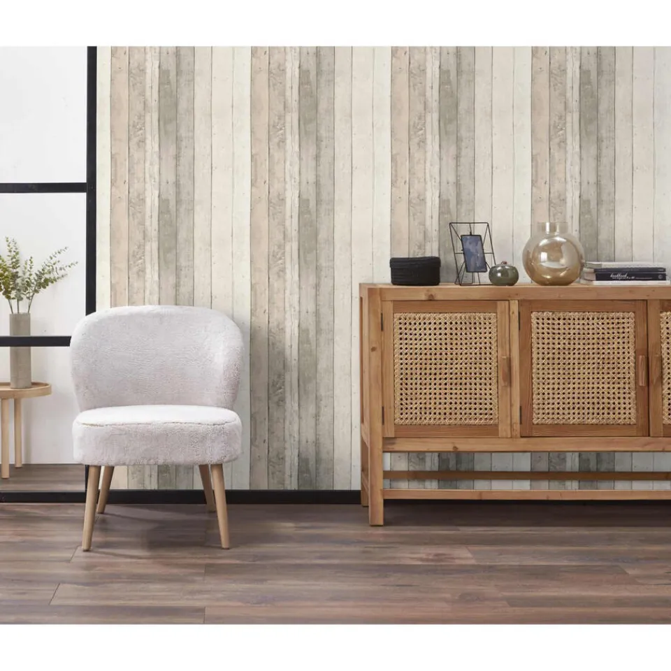 Stoer vliesbehang met steigerhoutprint. Kleur: grijs.