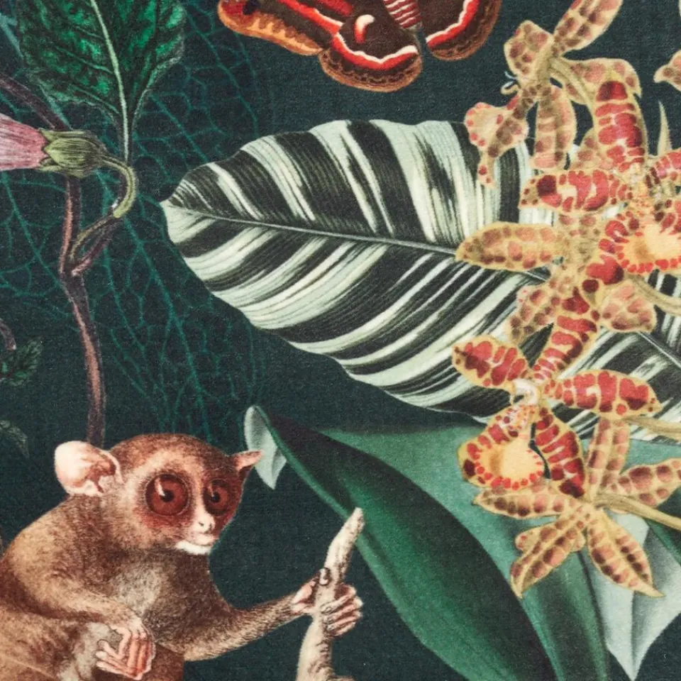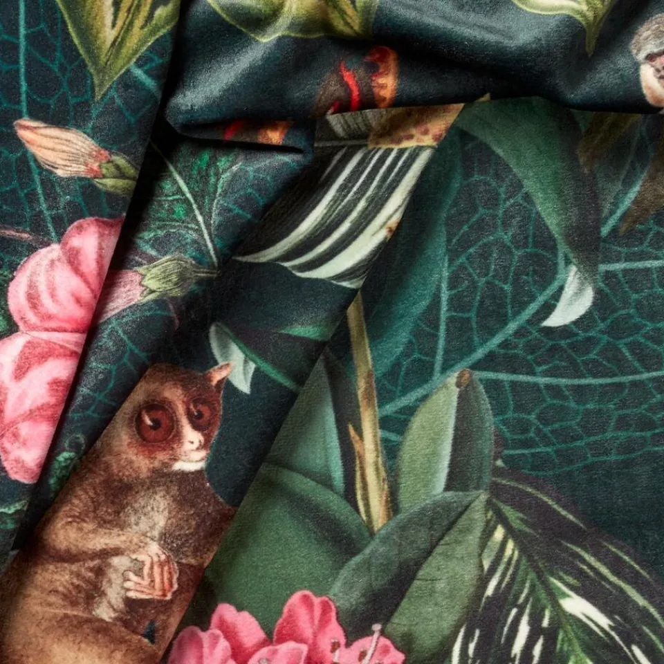 Lichtdoorlatende gordijnstof groen met bloemenprint. De glanzende velours stof is stevig, vormvast en soepel. 140 cm breed.