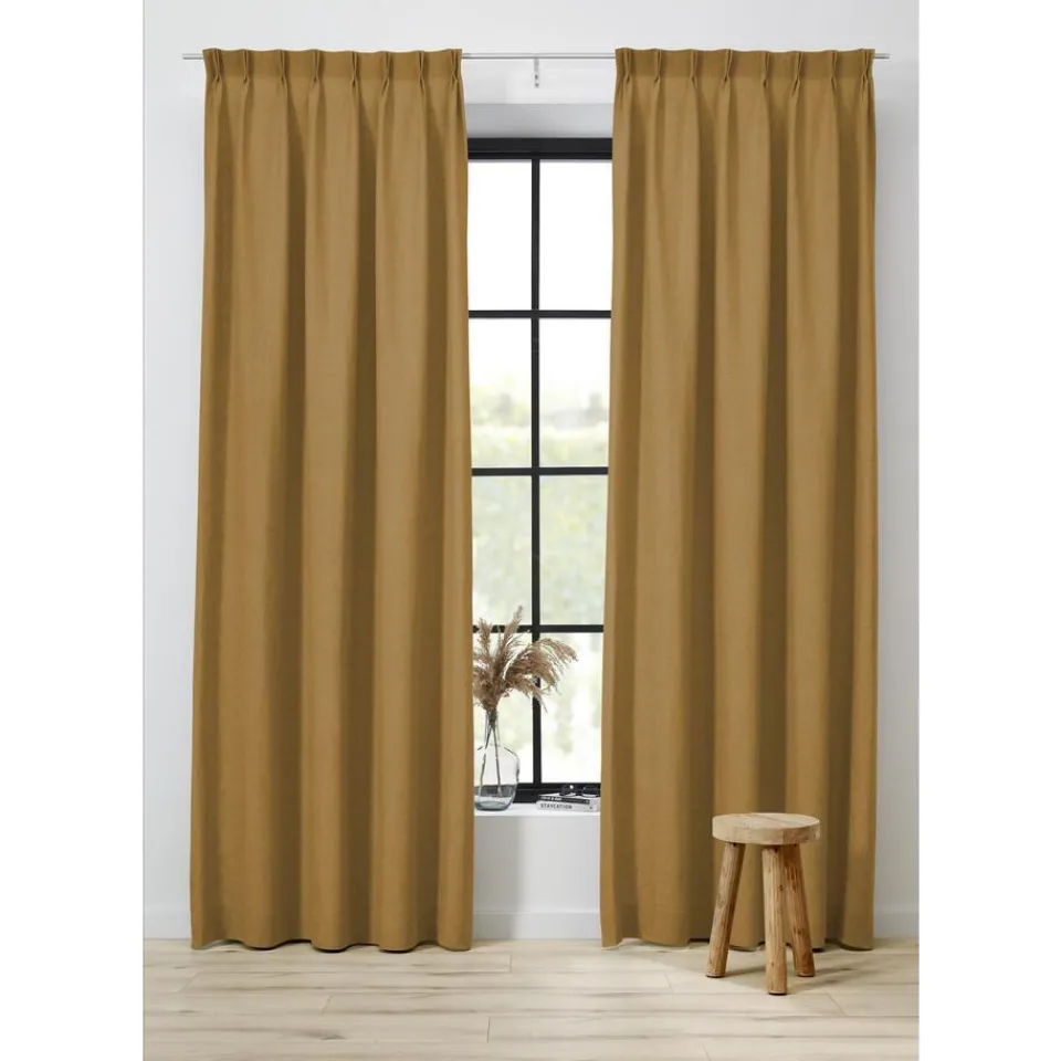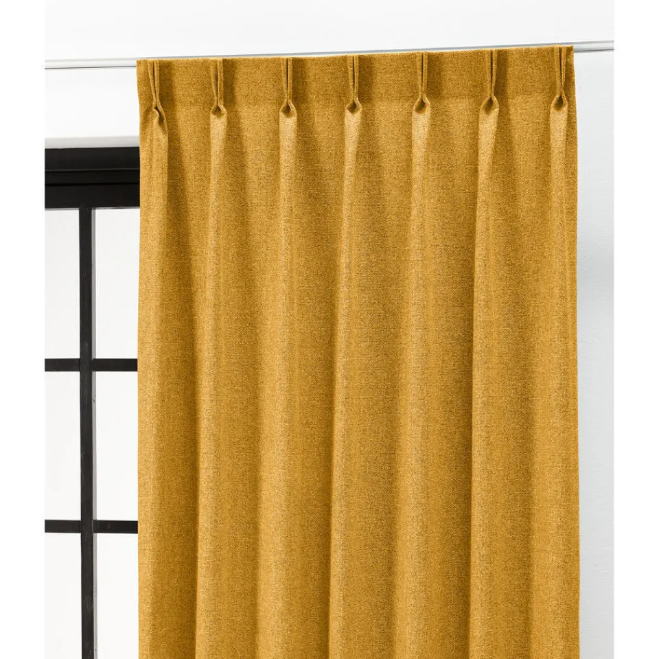 Gordijnstof van stevig donkergeel materiaal. Soepelvallend en kreukherstellend. 144 cm breed.
